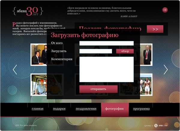 В отличие от Козьмы Пруткова, которому не удалось «объять необъятное», дизайнерам удалось «совместить несовместимое»: сайт получился одновременно и солидным, деловым, и в то же время праздничным. Это подчеркивает эффект бликов в расфокусе камеры на заднем фоне — сайт становится похож на фотографию из старого семейного архива