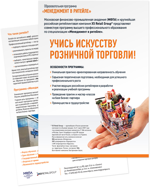 «Менеджмент в ритейле» — это совместная образовательная программа МФПА и X5 Retail Group (магазины «Пятерочка», супермаркеты «Перекресток», гипермаркеты «Карусель»). Для будущих менеджеров в области розничной торговли была подготовлена простая привлекательная листовка.